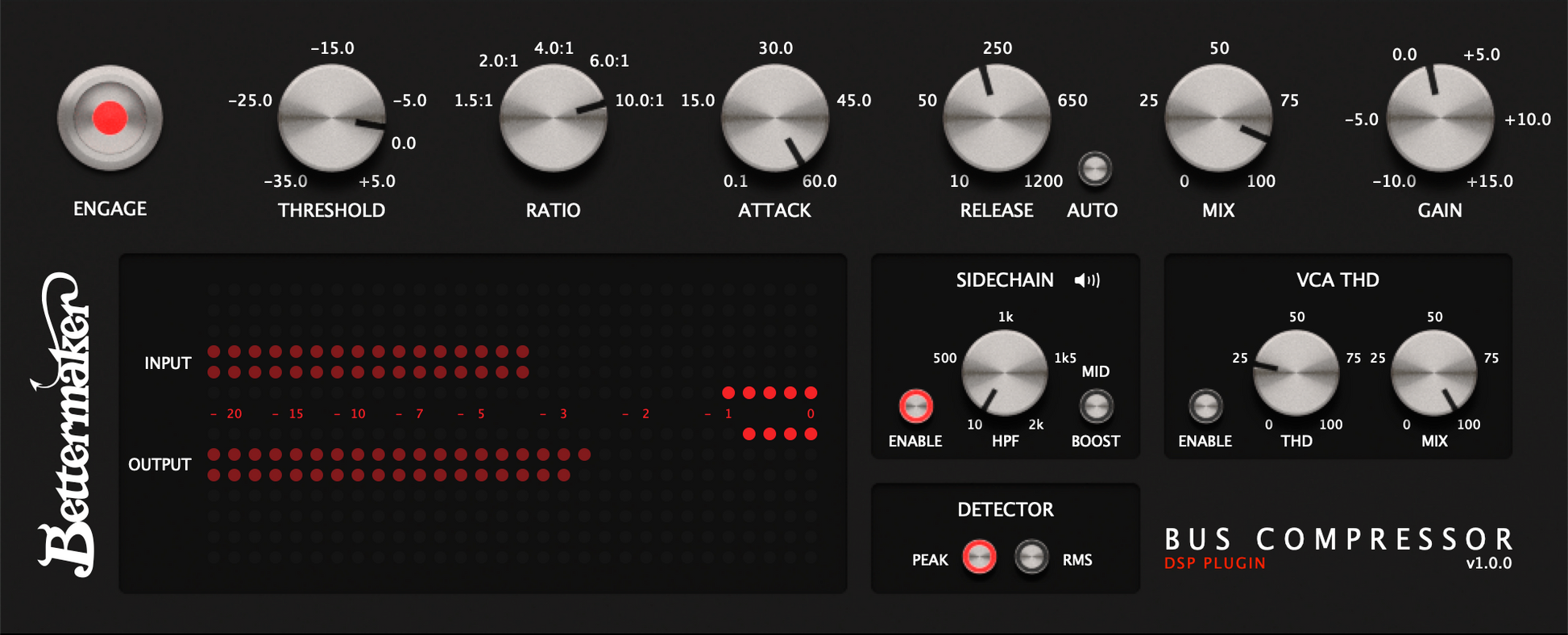 The Bettermaker Bus Compressor plugin features both Peak and RMS detection modes, making it an incredibly versatile compressor. Peak mode is intended for tight dynamics control and is perfect for taming aggressive drum transients. RMS mode provides smoother compression, ideal for sustained sounds like pads, basses, and vocal textures.