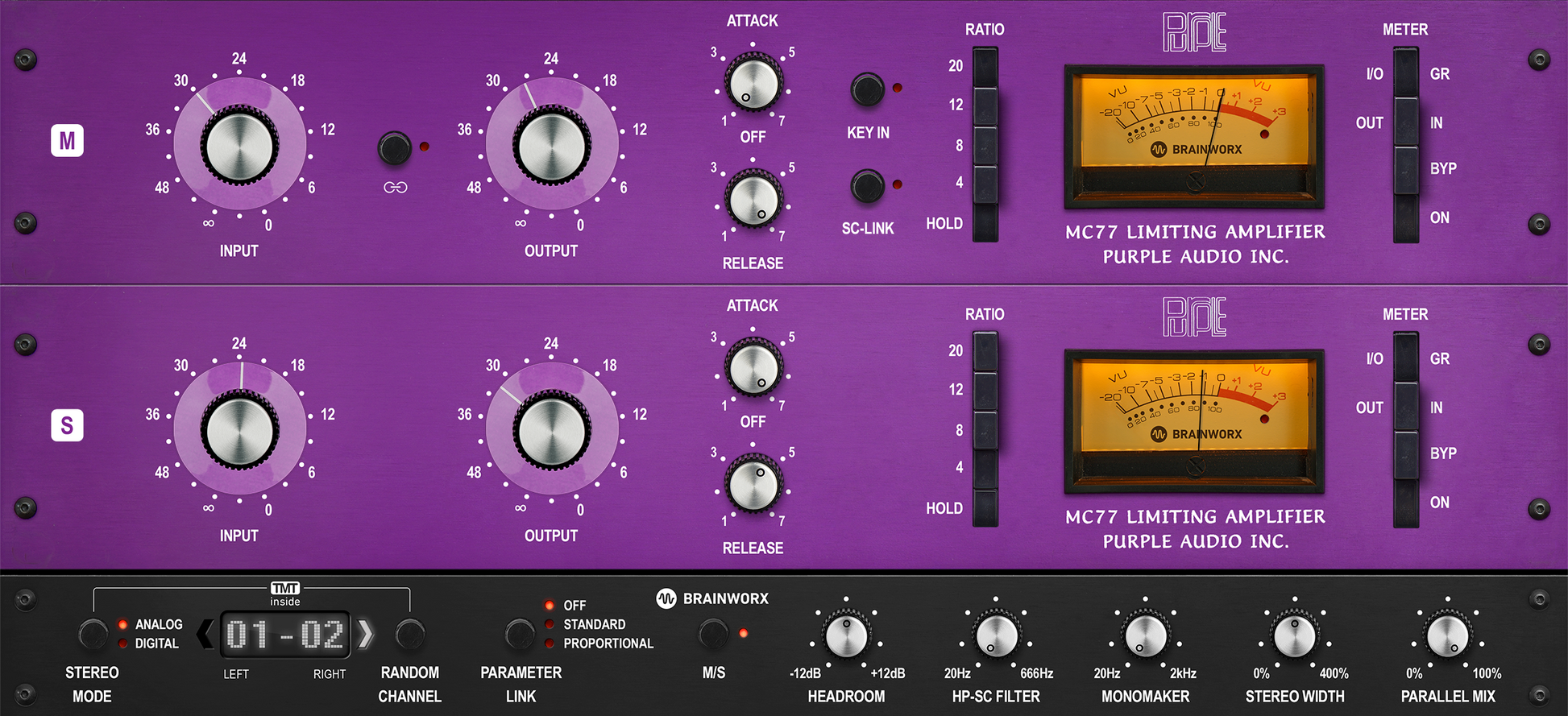 - Exacting emulation of the original Purple Audio MC77 Limiter