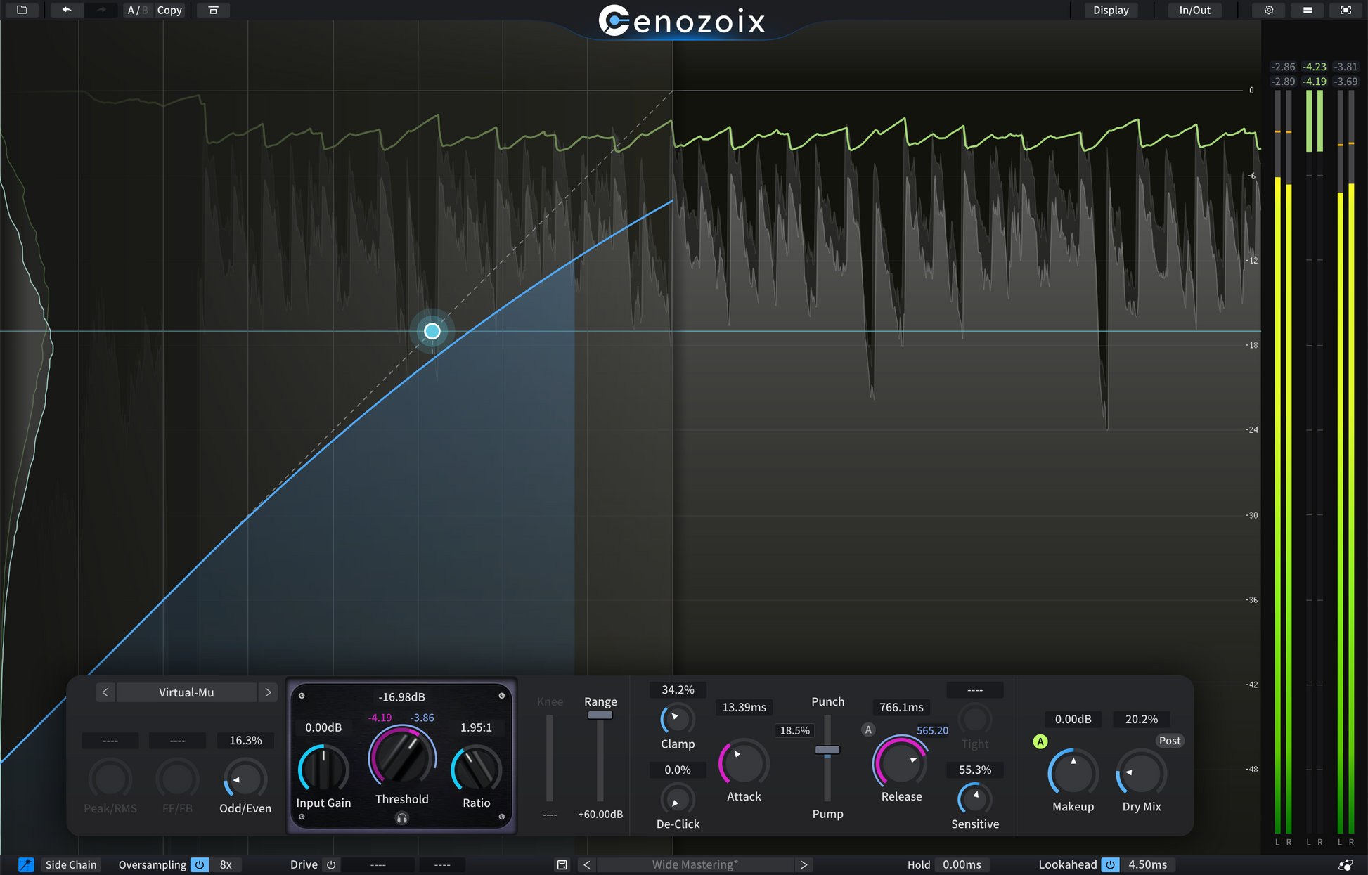 Ultra-fast attack and release times can lead to unwanted distortion when using existing compressors. The Cenozoix Compressor utilizes a warp mechanism to avoid these distortion effects, making it a top choice for peak and sidechain compression. Use it to tame harsh snare transients or create basslines that pump alongside your kick.