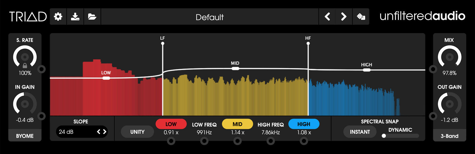 After the smashing success of BYOME, Unfiltered Audio is at it again with their latest creation, TRIAD. With the ability to split up the signal into three bands and apply BYOME effects to each band individually, this three-headed beast will put the rest of your plugins to shame.