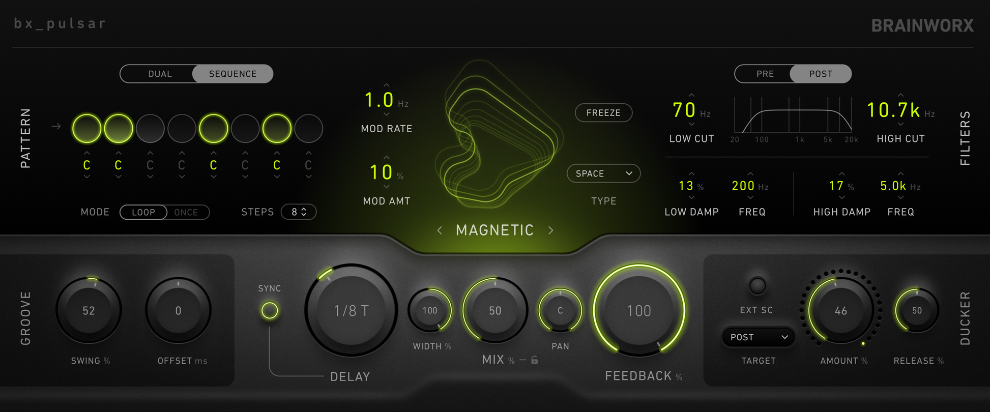 bx_pulsar is Brainworx’s new flagship creative delay plugin, a versatile creative powerhouse with the immediacy and sonic quality of a go-to processing plugin. Five core delay modes put a galaxy of delay style and color options right at your fingertips, while a flexible 8-step delay sequencer, multiple stereo modes, built-in sidechain ducking, freeze and groove controls provide the ideal toolset for producers and musicians wanting to explore the outer reaches of modern delay.