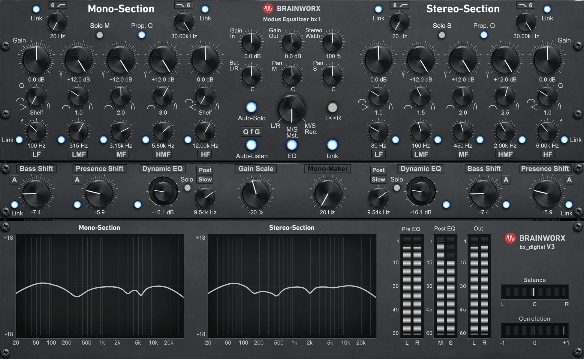 This 11-band EQ features fully parametric filters available in dual mono, stereo and M/S modes. It provides a stereo widener, mid/side decoder, the pioneering “Mono Maker” summing tool, spectrum-balancing Bass and Presence Shifters, and advanced monitoring and metering capabilities for mastering work.