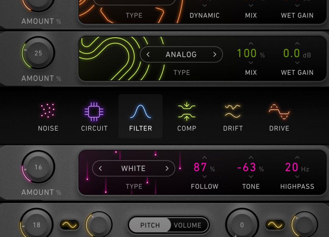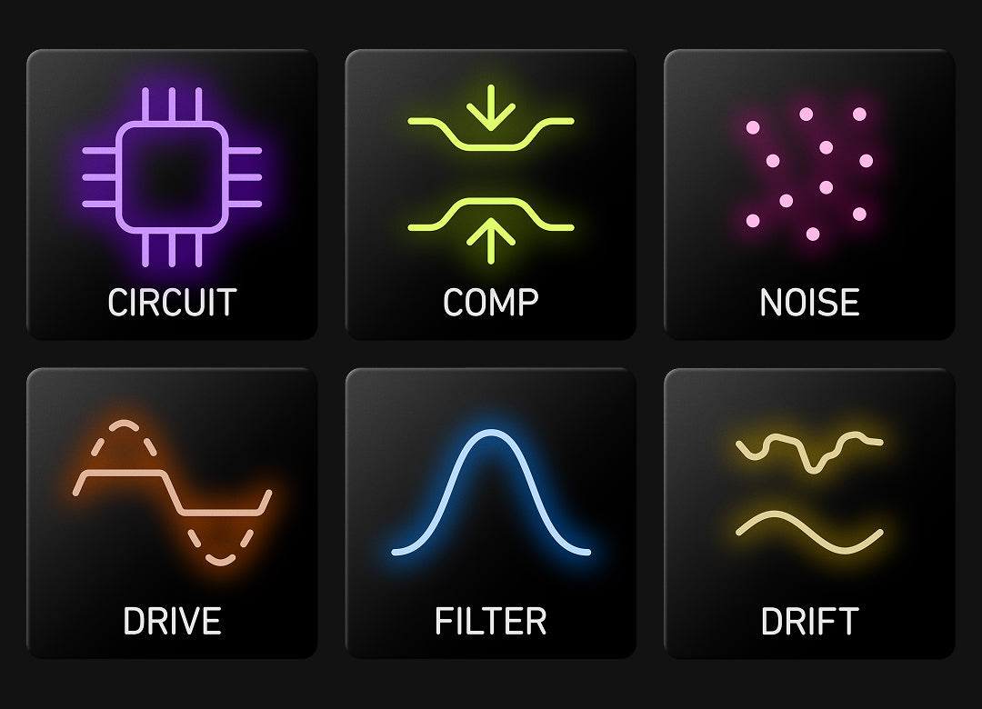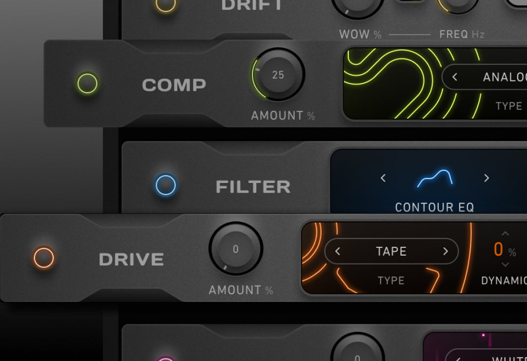 - Build custom FX racks with six reorderable modules: Drive, Circuit, Drift, Comp, Noise, Filter