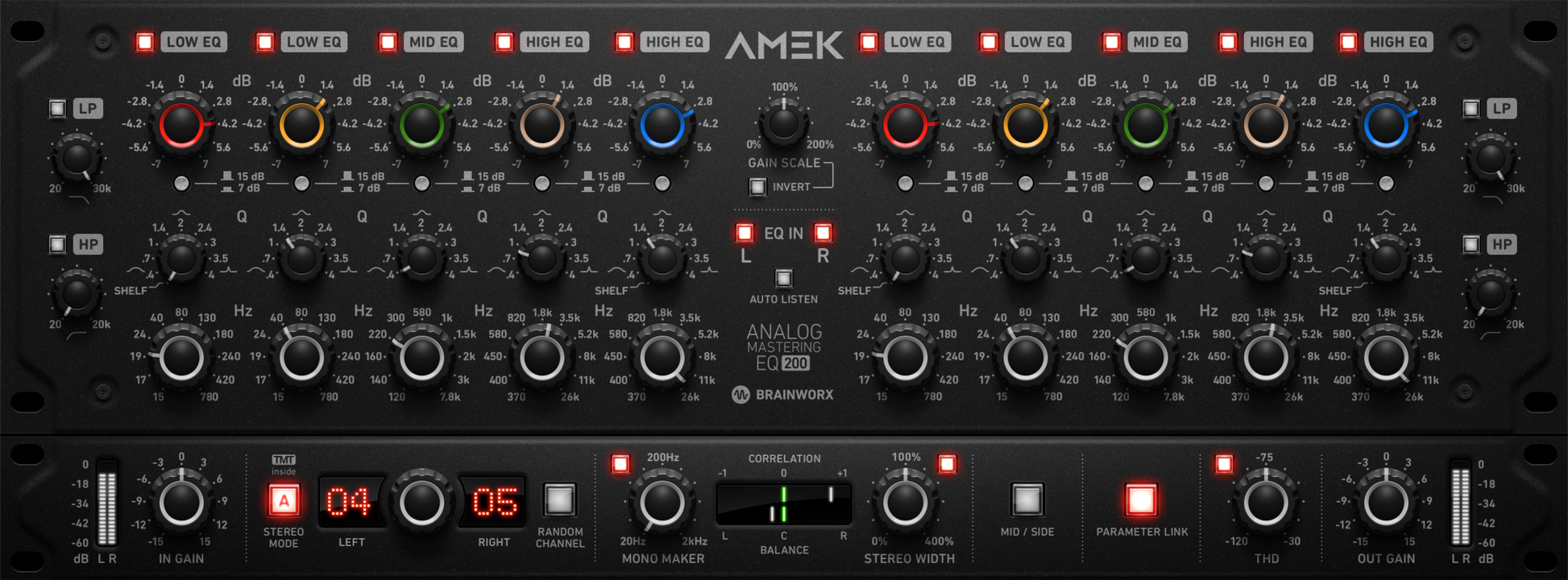 The AMEK EQ 200 has an analog vibe that sets it apart from surgical digital EQs. It also enhances the sound of its analog predecessors by incorporating useful plugin features. These upgrades include mid/side processing, a Mono Maker knob, a Stereo Width control, and comprehensive meters for input levels, output levels, phase correlation, and left-right balance.