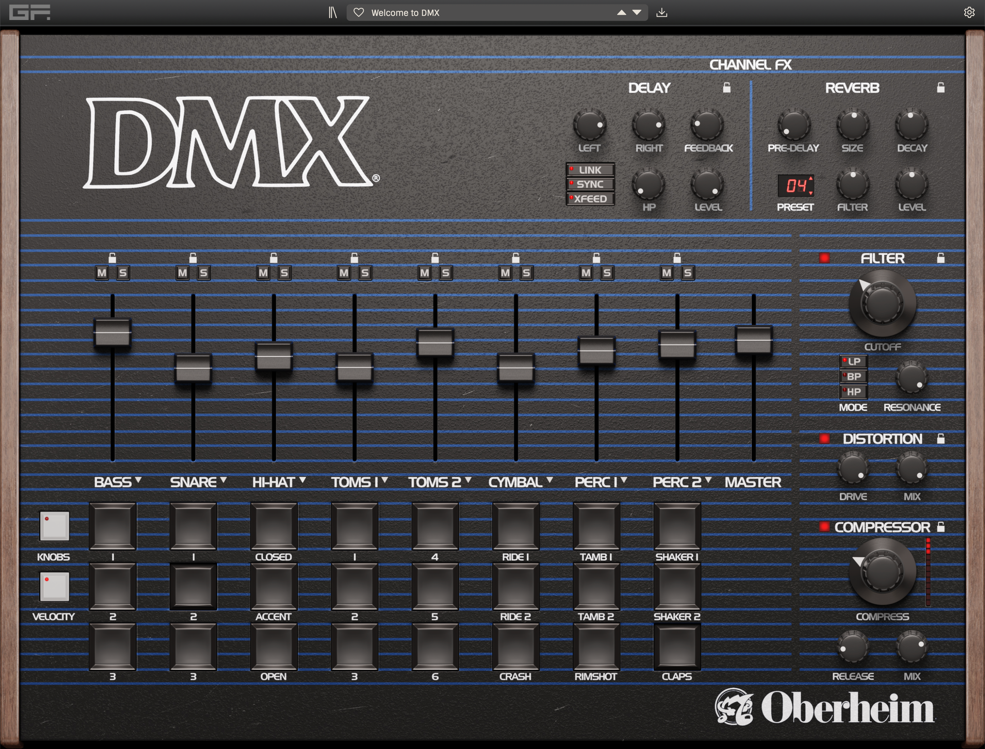 - Classic Sound, Modern Control — Dive into the original eight-part sound kit of the Oberheim DMX, now augmented with comprehensive control over pan, solo, mute, pitch, decay, analogue-style delay send, and the lush, spacious reverb send for each channel.