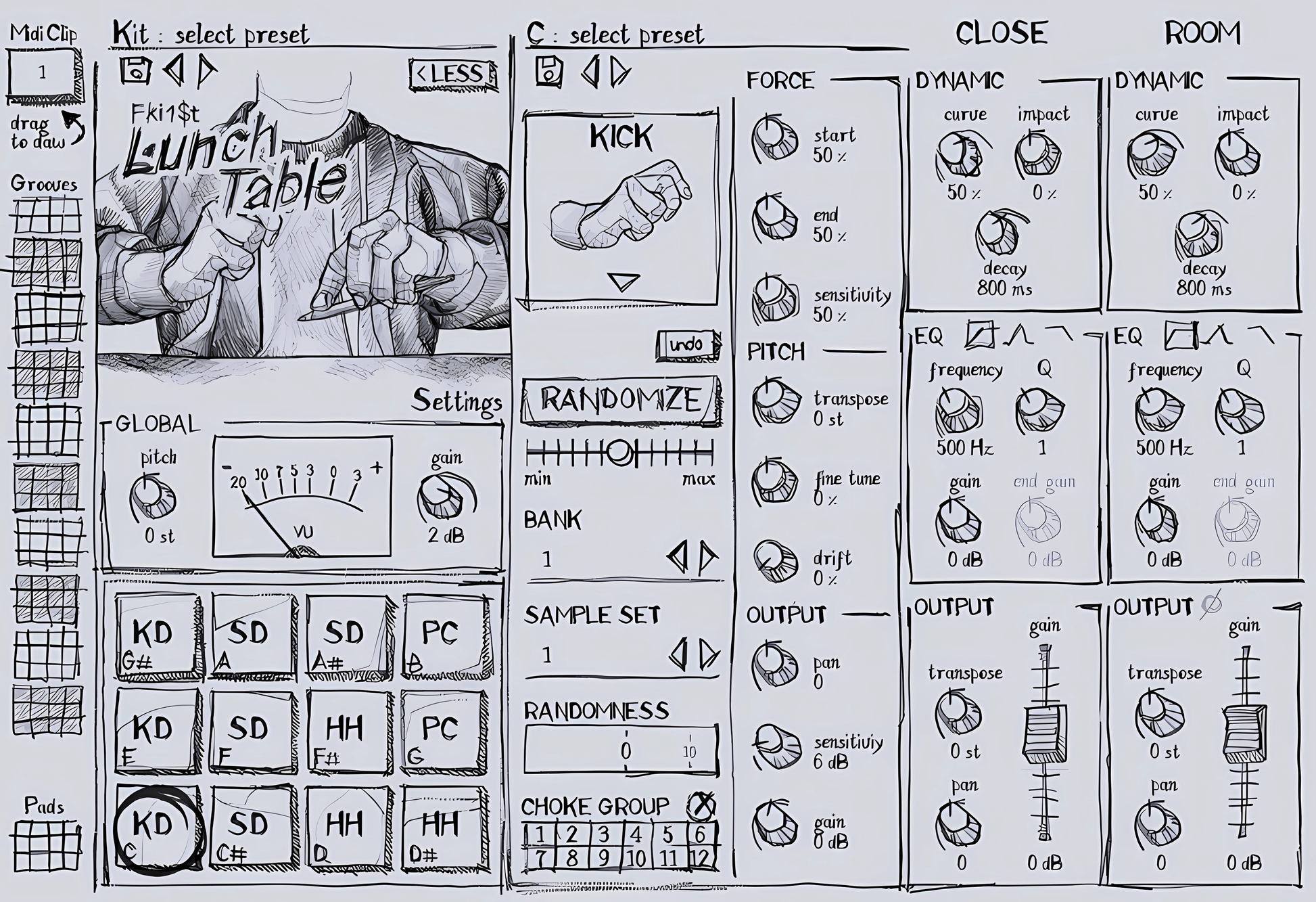 Drag and drop 100+ preloaded grooves into your daw as midi clips, or play live on the 12 one shot pads.