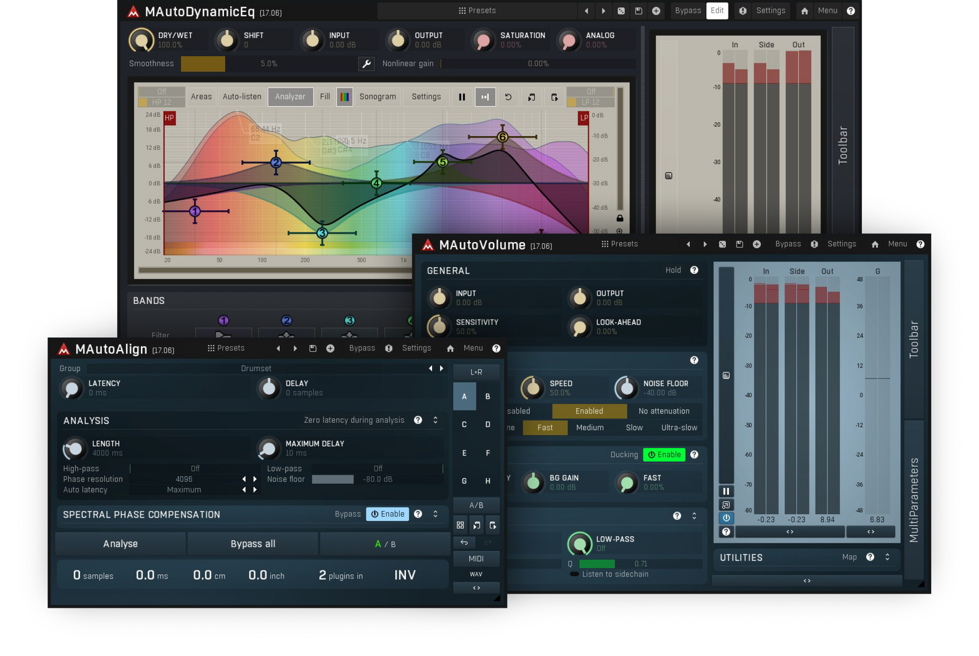 Its seven dynamic bands use smooth, variable-slope filters for de-essing, ducking, compression, expansion, and more. Plus quick-access presets for common tasks and powerful visual tools like an integrated analyser and sonogram. With full side-chain capability and modulators for deeper control, MAutoDynamicEq lets you sculpt, react, and automate your mix in ways a traditional EQ simply can’t.