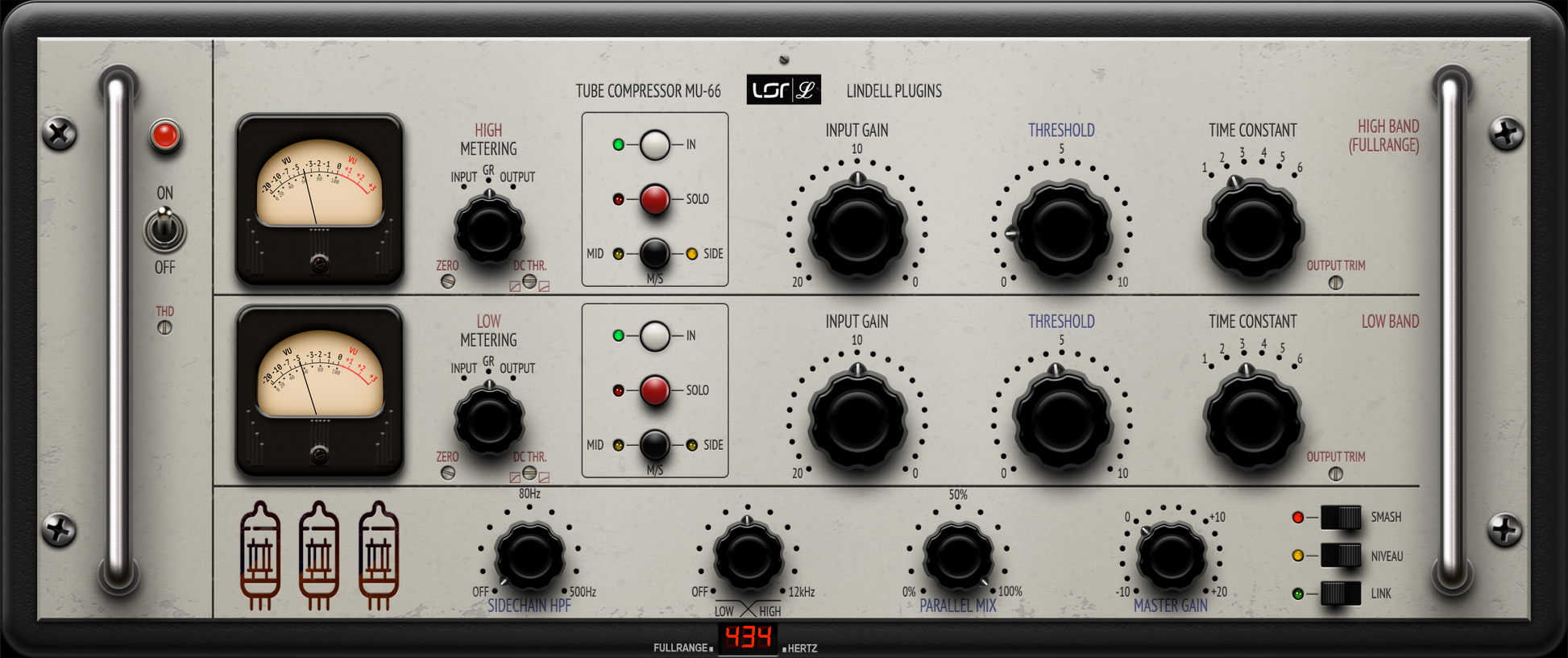 Use exact replications of the original parameters on the holy grail of tube compressors or push beyond. The Lindell Audio MU-66 includes various sidechain options, a SMASH switch for heavy compression effects, and a NIVEAU filter that leads to natural-sounding compression.