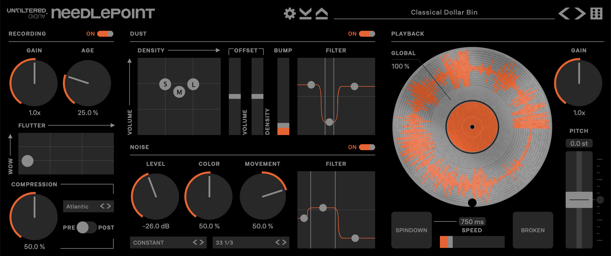 Unfiltered Audio raises the bar (and lowers the tonearm) with Needlepoint: a revolution in vinyl simulation. Featuring a full platter of advanced physical modeling technology, it offers a deep into the warm, fuzzy sound of turntable noises. Use it subtly for among the most convincing vinyl emulations available, or push the needle far past realism for some seriously warped sounds.