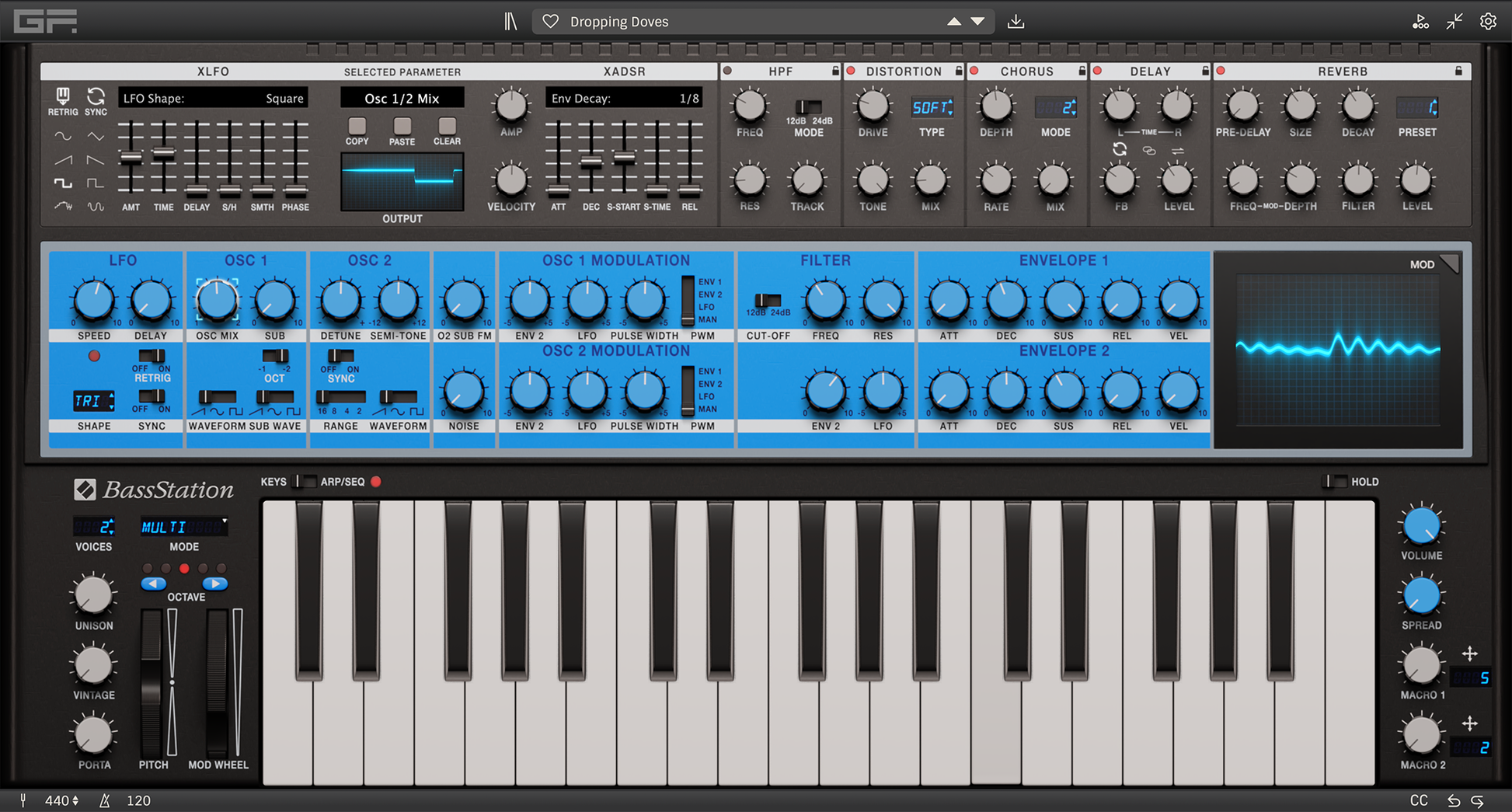 The Novation Bass Station by GForce, whilst remaining sonically faithful to the original, has been extensively enhanced, now offering polyphony, unison modes, a powerful modern sequencer, and expansive modulation capabilities with the advanced X-LFO and X-ADSR. These updates bring unprecedented depth and flexibility to the Bass Station’s iconic sound.