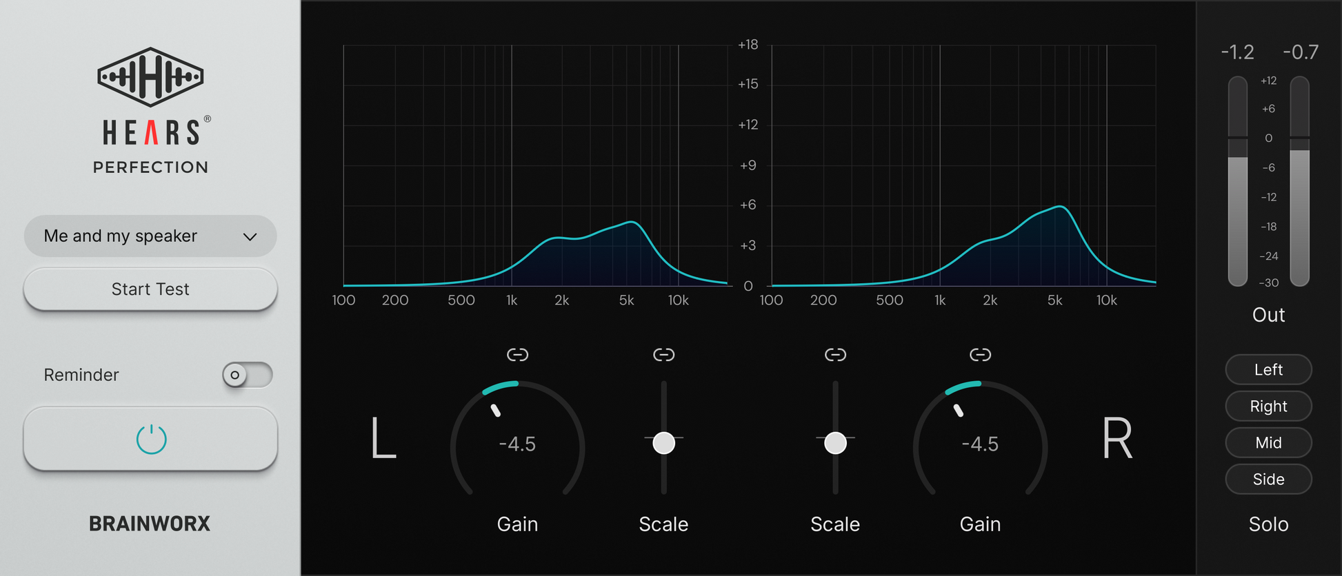 Developed by Brainworx in collaboration with the HEARS team, HEARS Perfection is the next generation of personalized hearing compensation. Using an optimized built-in hearing test, it pinpoints exactly where your hearing falls short and applies real-time correction – providing you with a perfectly flat and neutral listening environment tailored to the unique listening profile of your own ears.