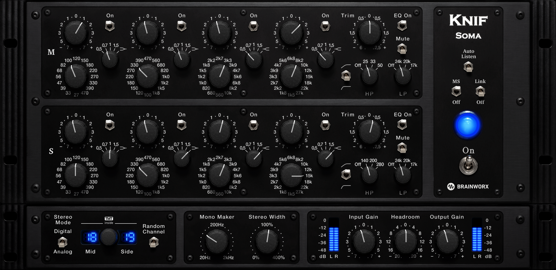 The plugin version of Knif’s Soma takes a high end analog EQ and updates it with extra features only possible in the digital domain. It is now easier than ever to increase or decrease the drive applied at the input and output stages to dial in just the right amount of analog goodness. The engineers at Brainworx have added indispensable tools for mastering, including a mono maker, stereo width control, and additional options for TMT.