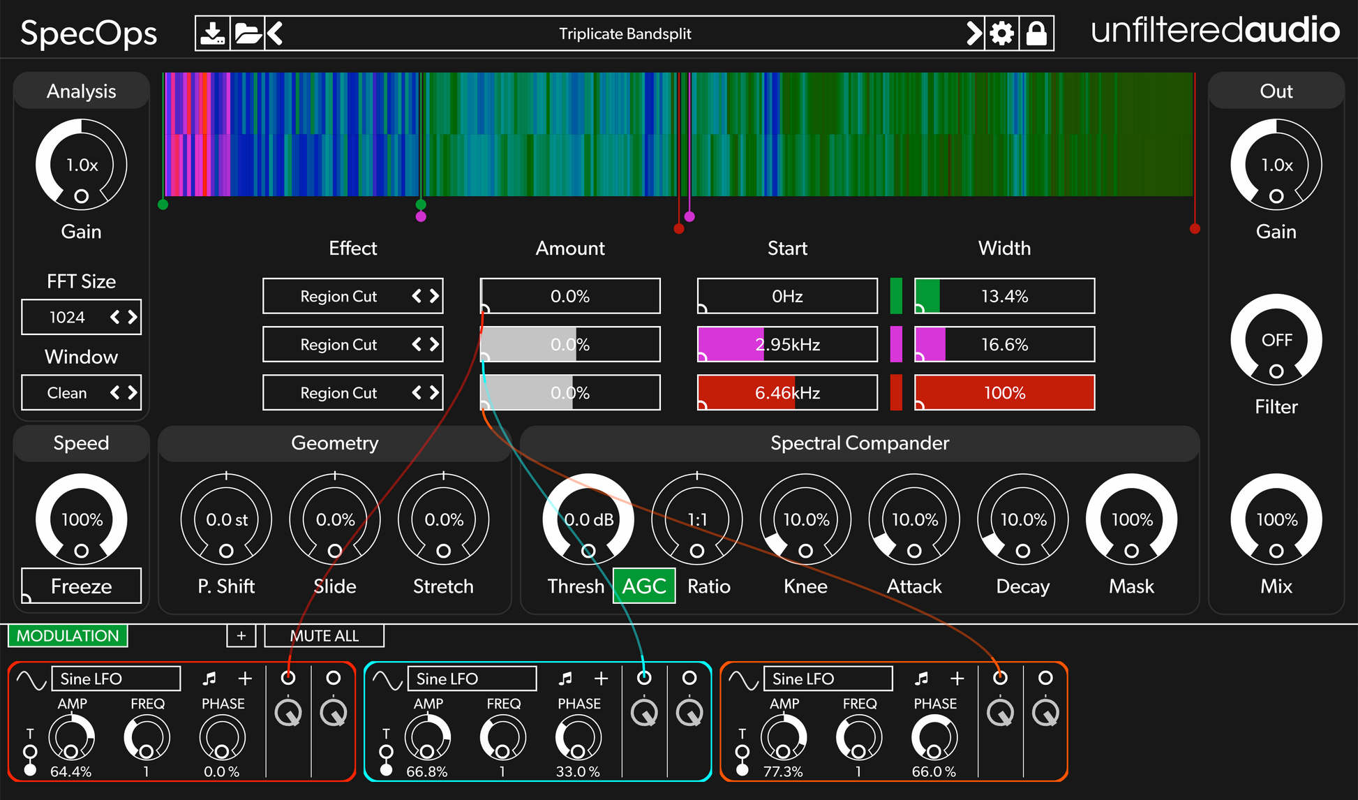 The applications are truly limitless and stretch from moderate processing for music production to severe mangling for sound design. SpecOps is your interstellar transporter to new worlds in electronic and experimental music: Tired, static synth pads come alive when you modulate the levels, filtering, pitch, noise or distortion in different frequency bins, creating ever-shifting timbral patterns your preset libraries could only dream of. Don’t own a synth? Freeze audio on an acoustic instrument track and apply pitch shift to create a spectral synthesizer. Experimental music producers and sound designers can use SpecOps’ train-wrecking effects to brutally transform a hi hat track into bursts of alien static or make pristine vocal tracks sound like R2D2 with a sore throat. SpecOps is also an industrial music producer’s destructive weapon: Modulate a frequency-dependent clipper on an electric bass guitar’s track to add nasty bottom-end distortion that pulsates perfectly in time with your music’s tempo.