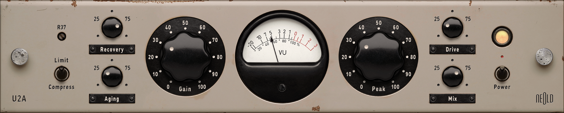 Analog LA-2As can sound substantially different from one another depending on age, components, and condition. Everyone has their favorite era; while some 2A plugins try to address this by offering alternate models, the NEOLD U2A takes it further. Thanks to the unique “Aging” knob, you can continuously vary the character from that of a freshly serviced unit with a new opto cell to an age-old vintage device in its original, unaltered state.