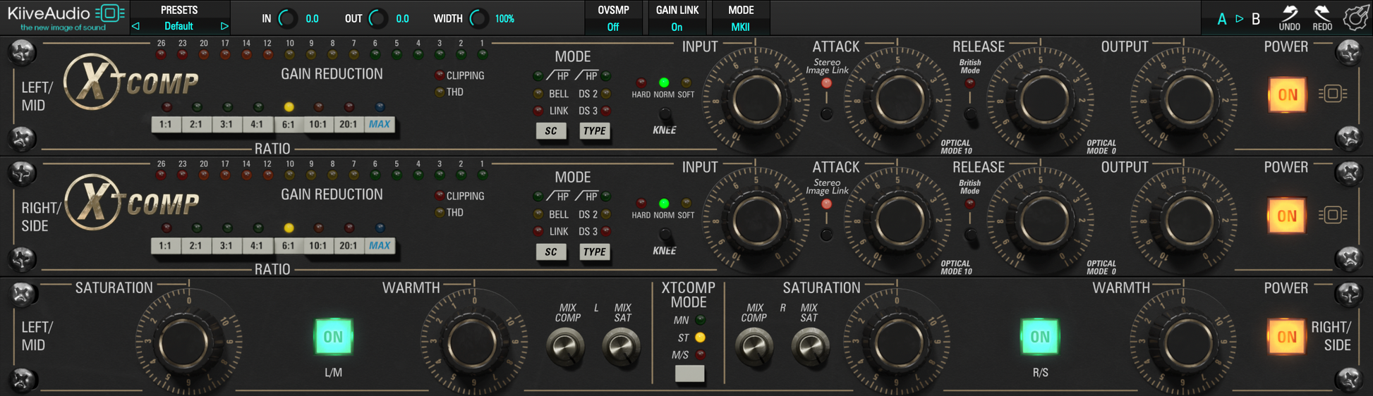 Kiive Audio has taken this compressor to the next level with plugin-only options. There are dual mix knobs for the compressor and saturator modules, allowing you to apply parallel processing. A Gain Link switch has also been added, making level-matched A/B comparisons simple.